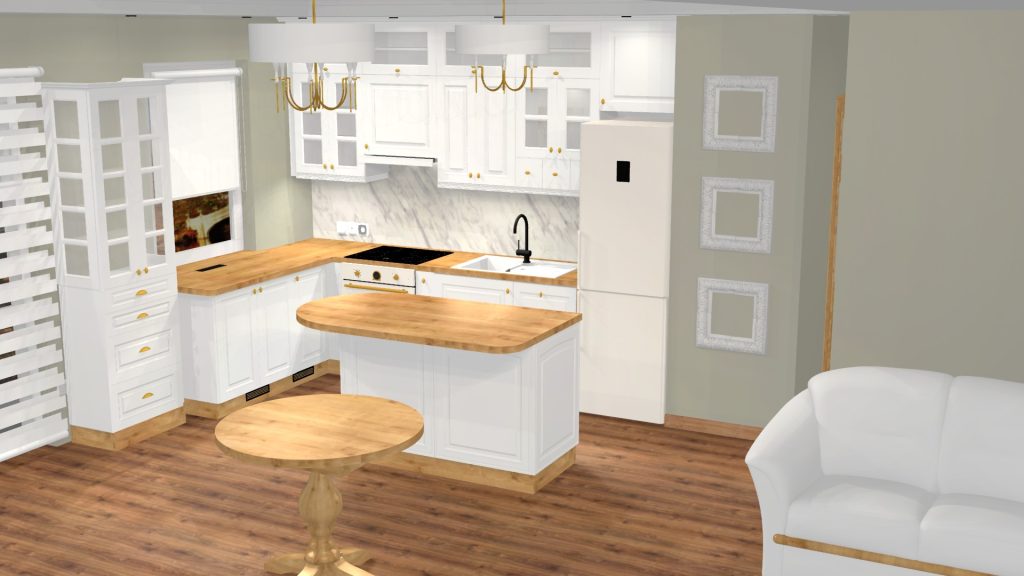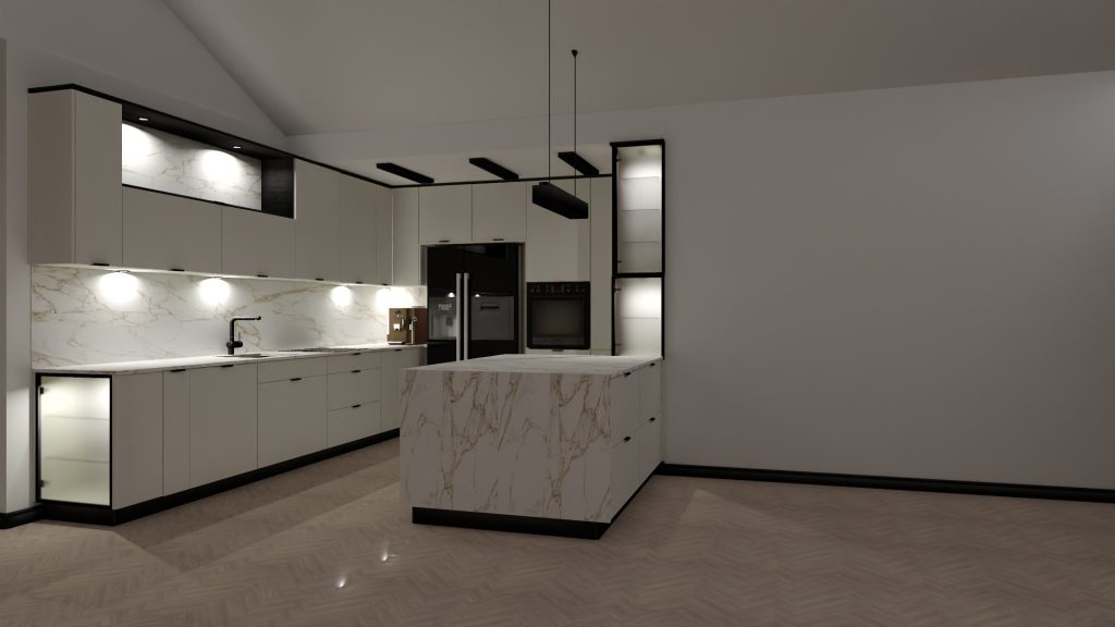 Ta kuchnia to połączenie elegancji i funkcjonalności w minimalistycznej formie. Jasne, matowe fronty zestawione z marmurowymi blatami o złotych żyłkach