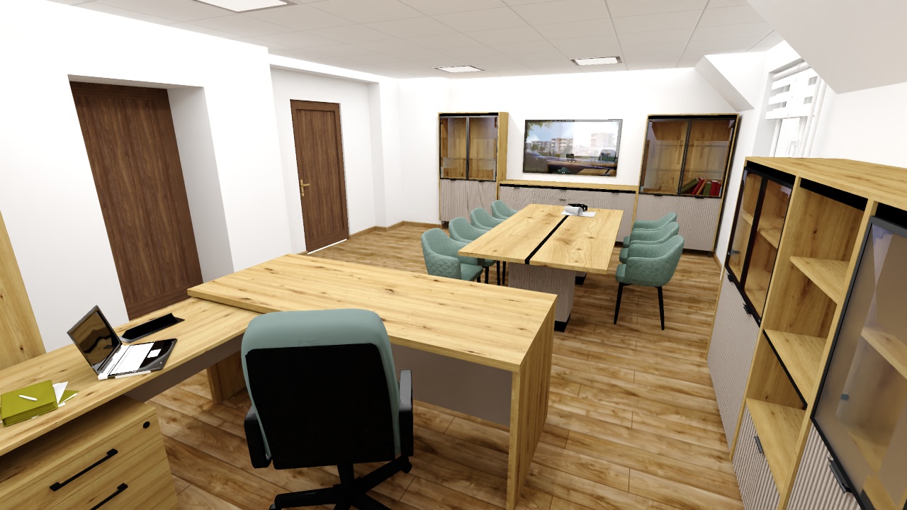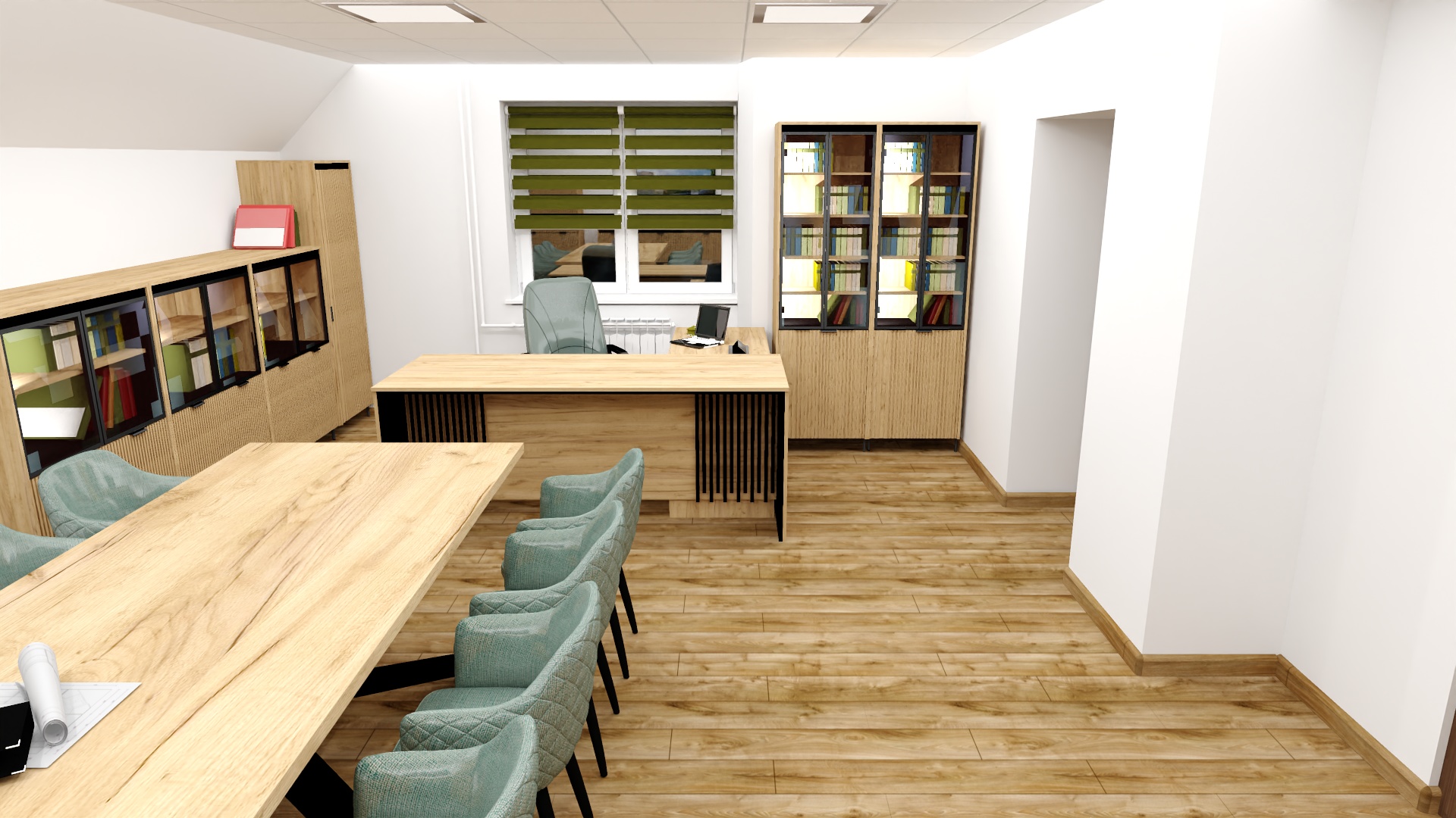 Akcenty kolorystyczne w postaci tapicerowanych foteli w odcieniu morskiej zieleni i szarości równoważą ciepło drewna, dodając świeżości i elegancji. Stonowana paleta kolorów sprzyja koncentracji i kreatywności. Funkcjonalność została przemyślana w każdym detalu – przestronna strefa konferencyjna z dużym stołem, ergonomiczne stanowiska pracy, pojemne systemy przechowywania ze szklanymi wstawkami oraz optymalne oświetlenie naturalne i LED.