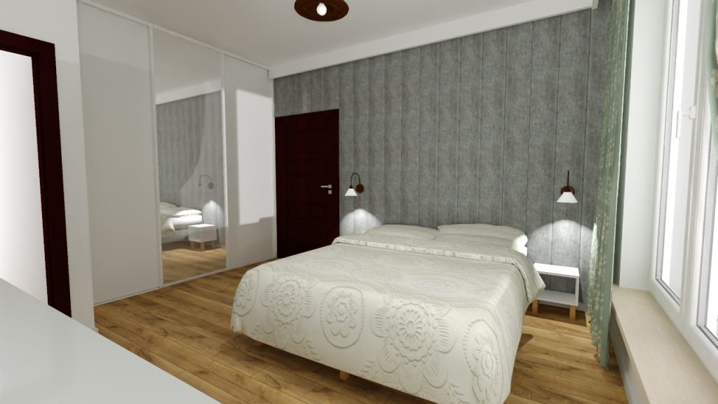 Nowoczesna i przytulna sypialnia utrzymana w harmonii szarości i naturalnego drewna. Centralnym punktem jest łóżko z delikatną, kremową narzutą, a