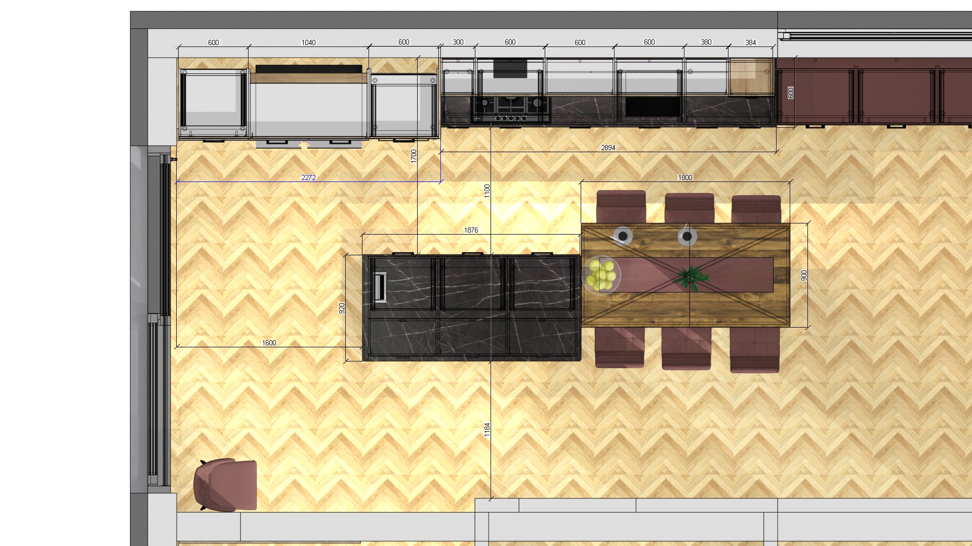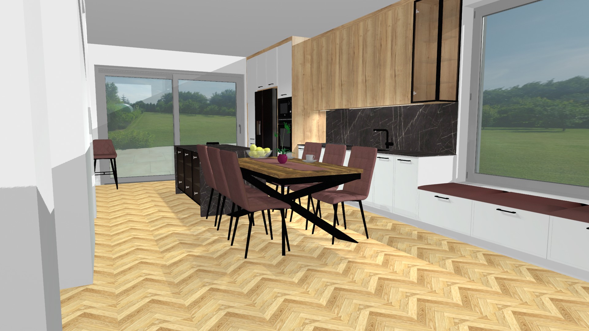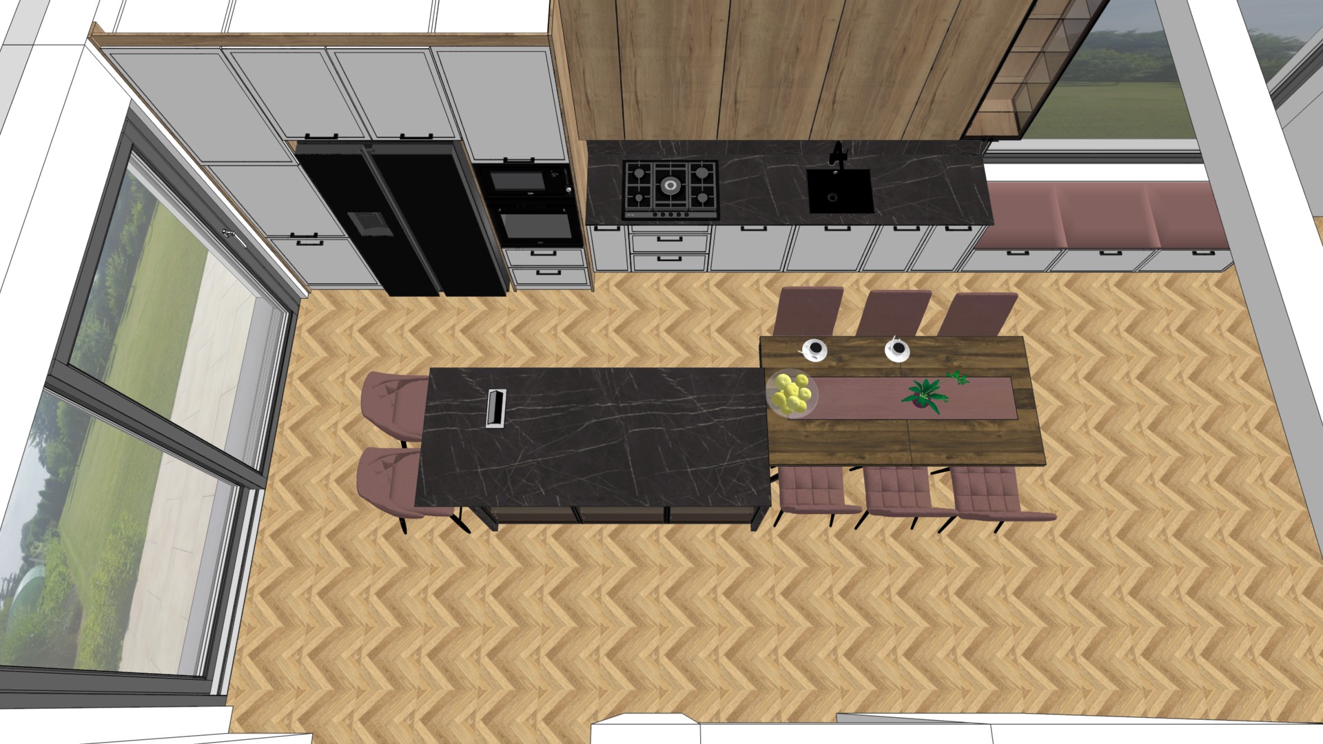Drewno odgrywa tu główną rolę – jego ciepła barwa i naturalna faktura nadają wnętrzu przytulności oraz harmonii. Całość dopełniają czarne akcenty – blaty, sprzęty i detale – które wprowadzają nutę elegancji i współczesnego charakteru. Przestronne okna zalewają kuchnię naturalnym światłem, wydobywając piękno materiałów i tworząc przyjemną, jasną atmosferę przez cały dzień. Układ pomieszczenia został zaprojektowany tak, by codzienne czynności – gotowanie, przechowywanie i wspólne posiłki – były nie tylko wygodne, ale też estetycznie spójne.