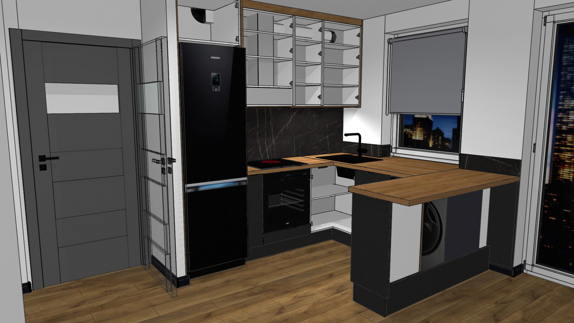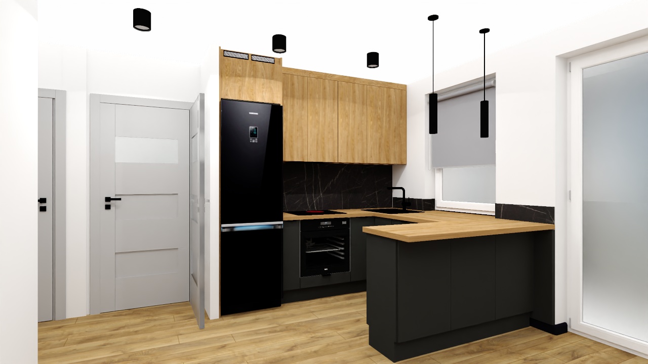 W projekcie wykorzystano kontrastowe zestawienie czerni, bieli i drewna, które tworzy elegancką i nowoczesną kompozycję. Ciepło drewnianych blatów i podłogi harmonizuje z minimalistycznymi, czarnymi frontami oraz jasnymi elementami zabudowy, nadając wnętrzu ponadczasowy charakter.