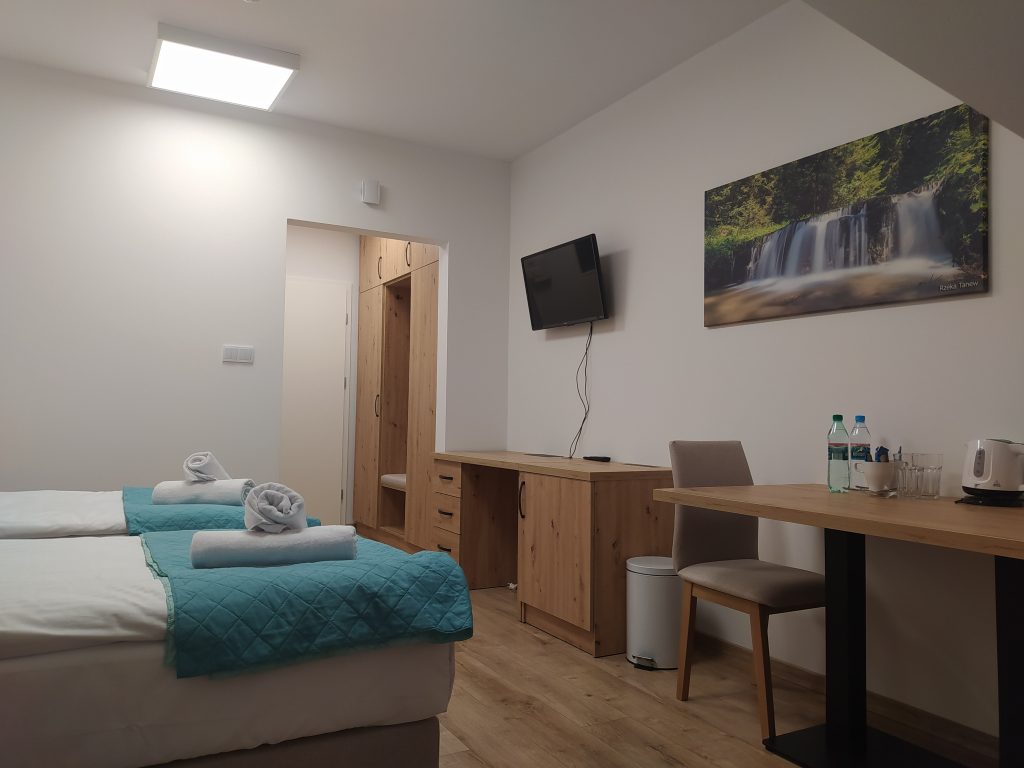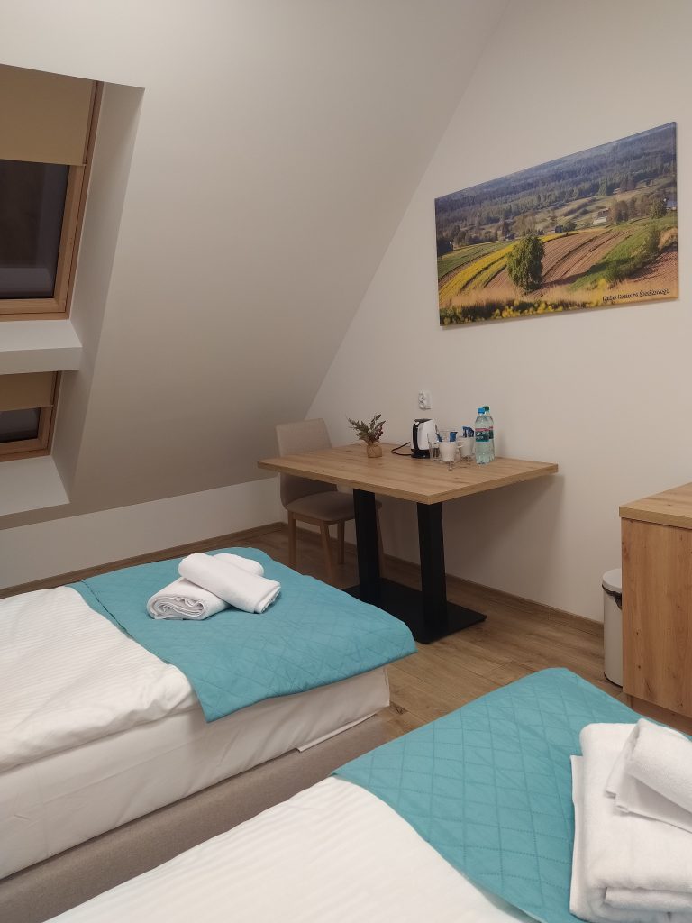 Przytulne wnętrza hotelowe, w których jasne kolory, naturalne drewno i subtelne akcenty tworzą atmosferę spokoju. Funkcjonalny układ i dopracowane detale sprawiają, że pobyt staje się czystą przyjemnością – zarówno dla osób podróżujących służbowo, jak i gości szukających relaksu.