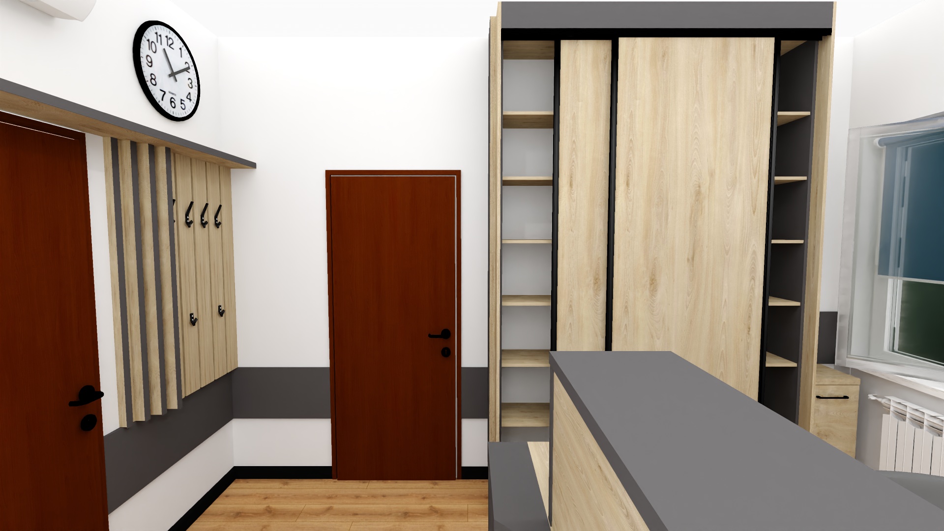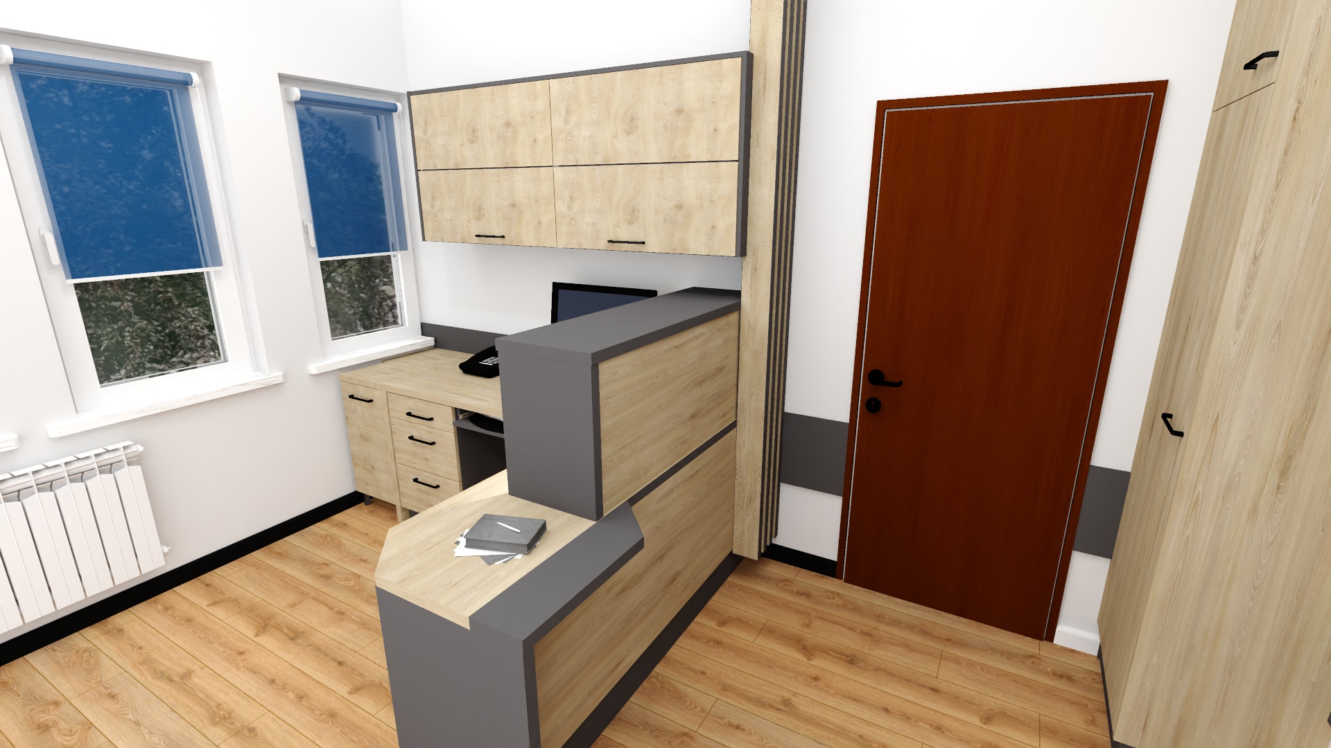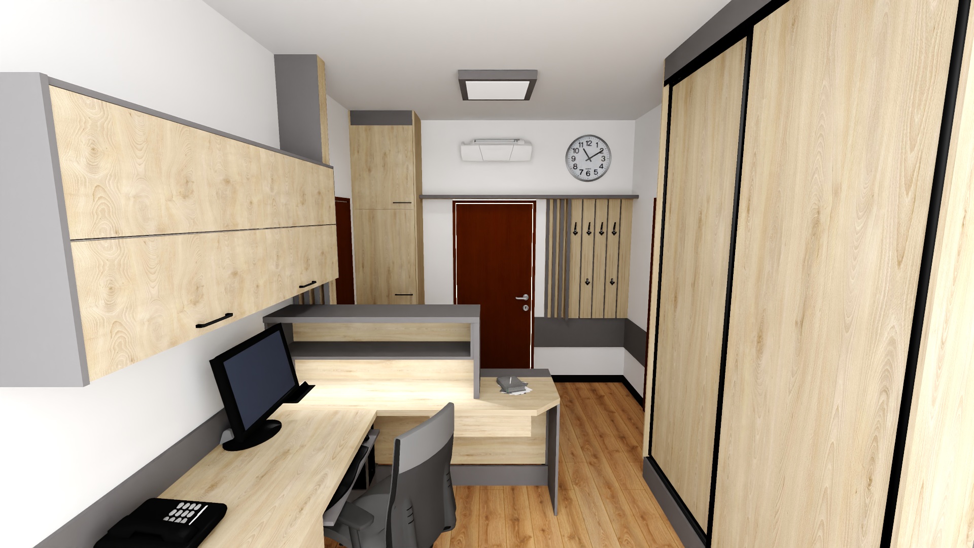 Nowoczesny projekt sekretariatu łączy w sobie maksymalną funkcjonalność z eleganckim, reprezentacyjnym charakterem. Ergonomiczne rozmieszczenie mebli, odpowiednia ilość miejsca do przechowywania oraz wygodna przestrzeń do pracy sprawiają, że biuro działa sprawnie i profesjonalnie. Jednocześnie ciepłe wykończenia w naturalnym drewnie, minimalistyczne akcenty i klarowna geometria form budują atmosferę nowoczesności i prestiżu.