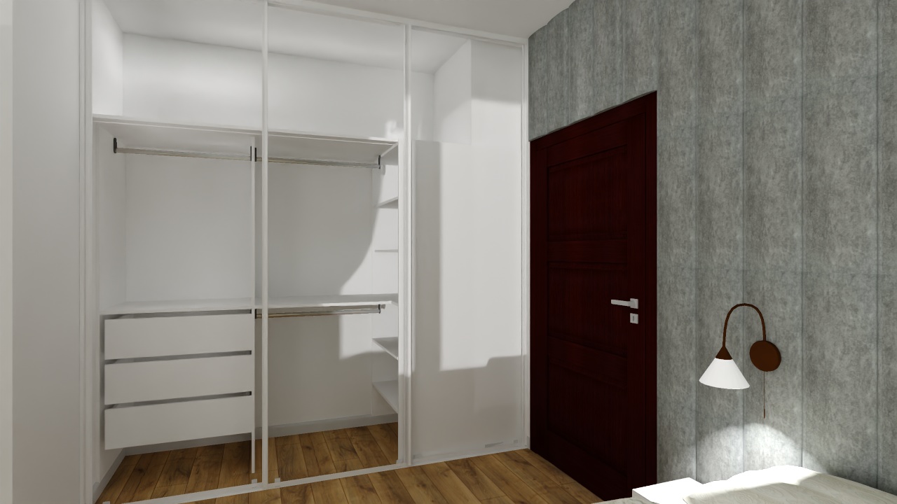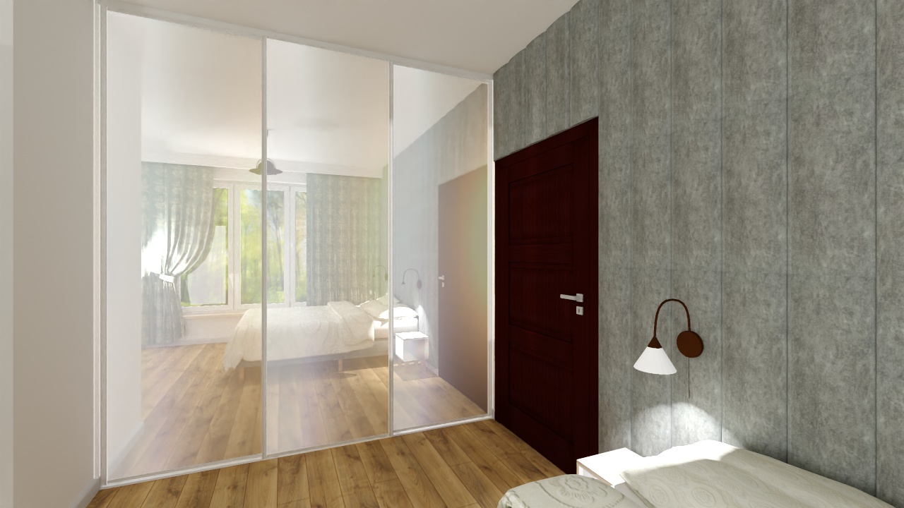 Nowoczesna i przytulna sypialnia utrzymana w harmonii szarości i naturalnego drewna. Centralnym punktem jest łóżko z delikatną, kremową narzutą, a tło stanowi miękka, tapicerowana ściana w odcieniu chłodnej szarości. Po obu stronach łóżka umieszczono proste stoliki nocne i eleganckie kinkiety, które tworzą nastrojowe oświetlenie. Drewniana podłoga dodaje ciepła, a duża szafa z lustrzanymi frontami optycznie powiększa przestrzeń.Zasłony w zielonym tonie wprowadzają akcent natury i subtelnej świeżości.